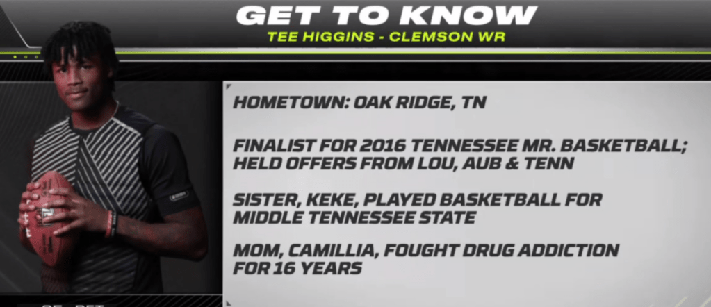 Higgins was being drafted 33rd overall by the Cincinnati Bengals when the graphic was shown. Underneath his hometown, info about his basketball history and noting that his sister plays college basketball was a fact about his mother. It highlights his mother, Camillia’s 16-year drug addiction.